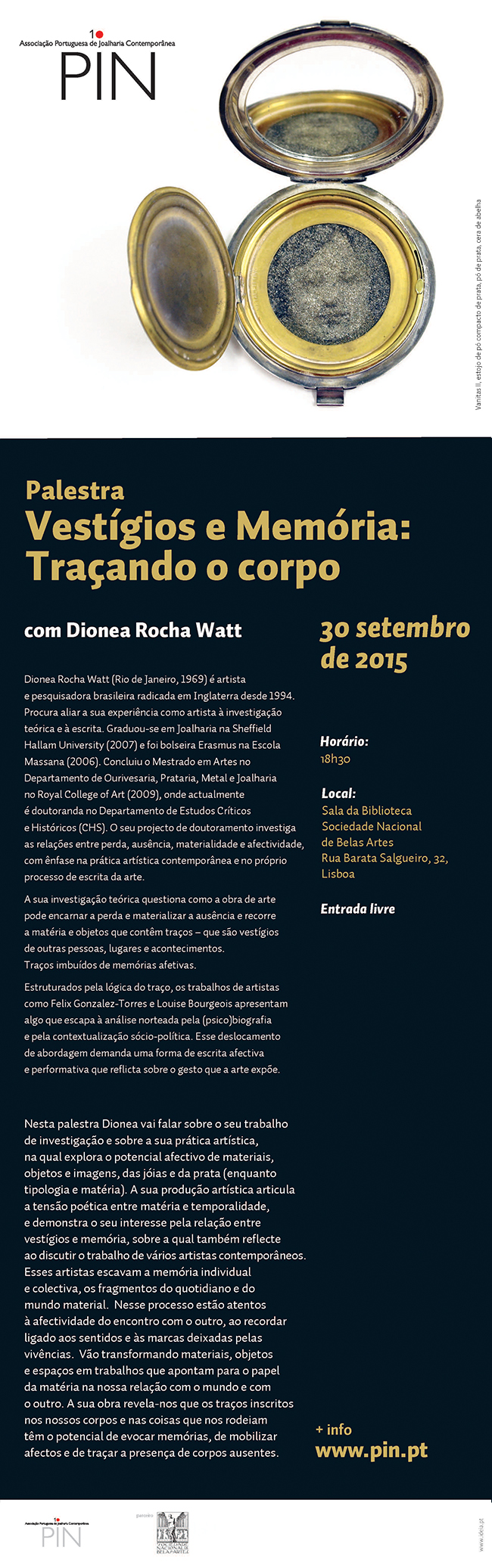 Vestígios e Memória: Traçando o corpocom Dionea Rocha Watt30 de Setembro, 18.30hSala da BibliotecaSociedade Nacional de Belas ArtesRua Barata Salgueiro, 32, LisboaEntrada livre