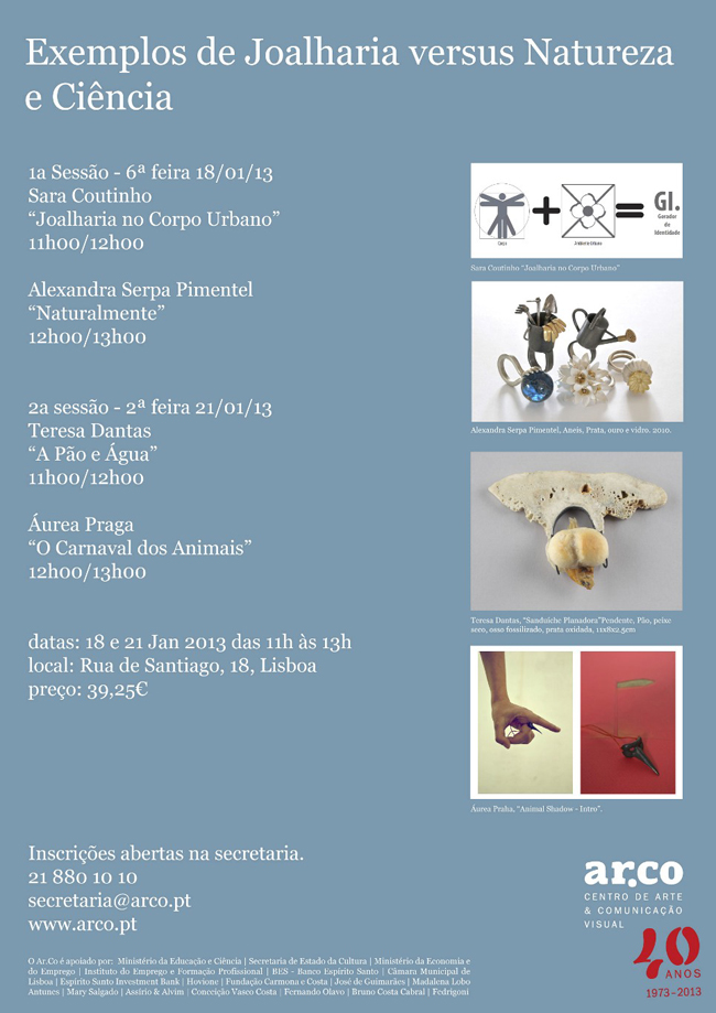 Sara Coutinho, Áurea Praga e Teresa Dantas irão apresentar o resultado dos projectos de mestrado em joalharia que desenvolveram recentemente. Os três projectos de forma bastante distinta reflectem temas de interesse ao projecto que o departamento de Joalharia tem em curso com o Museu de História Natural e da Ciência, em Lisboa. São três olhares "plásticos" sobre a joalharia enquanto reflexão social, poética e narrativa. Alexandra Serpa Pimentel irá apresentar a obra que tem vindo a desenvolver desde 1970 com especial enfoque nos trabalhos ligados à área da Natureza e da Ciência.