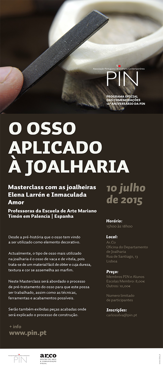 O OSSO APLICADO À JOALHARIA Masterclass com as joalheiras Elena Larrén e Inmaculada AmorAr.Co10 jul 2015, das 15h às 18h {tortags,3001,1}