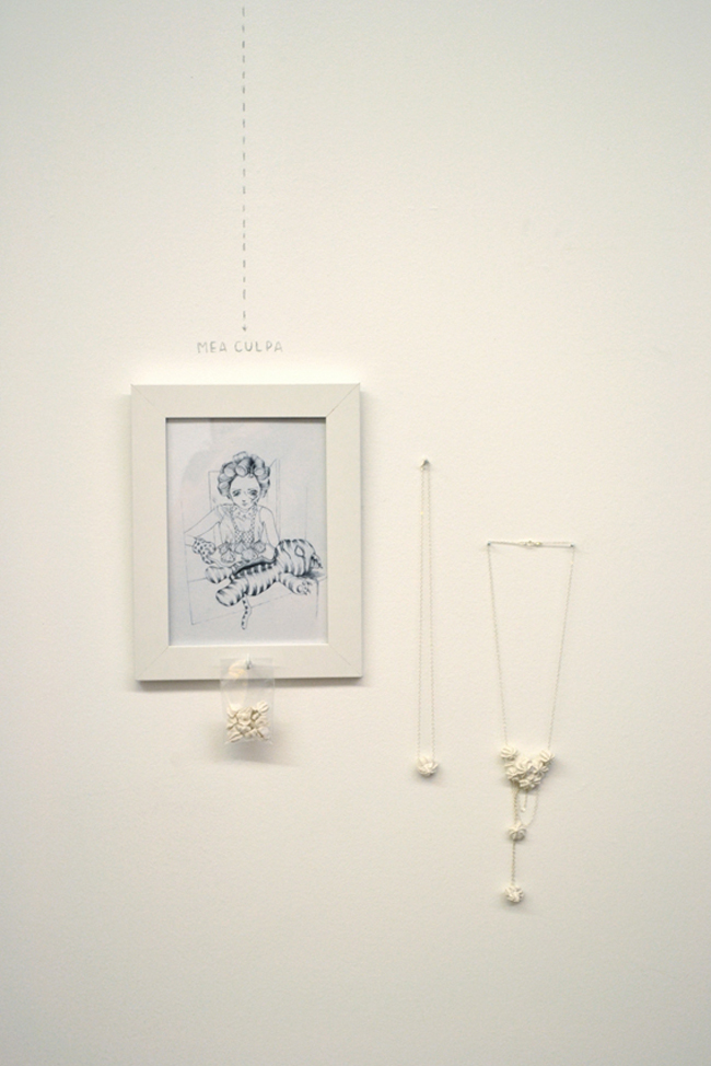 “Mea Culpa” é uma série constituída por uma ilustração e um conjunto de peças de joalharia que explora o relacionamento do ser humano com a culpa, através de uma cerimónia simbólica de aceitação. Cada peça contém um elemento em gesso que reveste um pormenor de esmalte. Quando se parte o gesso abre-se espaço a uma reconciliação com os erros pessoais, que podem então ser usados como algo precioso. A ilustração, por sua vez, contém um lugar onde podem ser guardados os fragmentos restantes deste ritual.