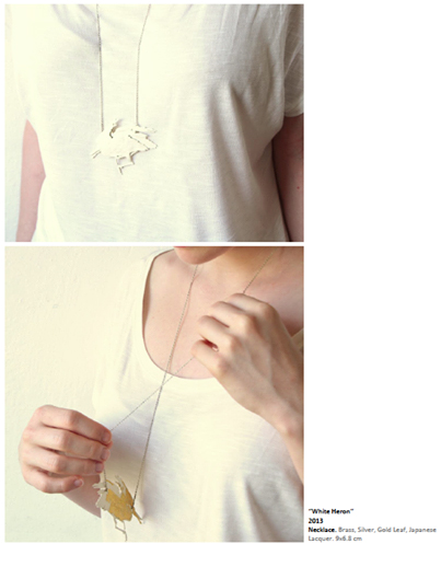 White Heron, 2013, colar, latão, prata, folha de ouro, laca japonesa; 9x6.8 cm