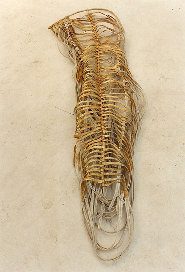 Maria José Oliveira; “Escultura para um corpo”; tela crua, folha de ouro e barro (1985)