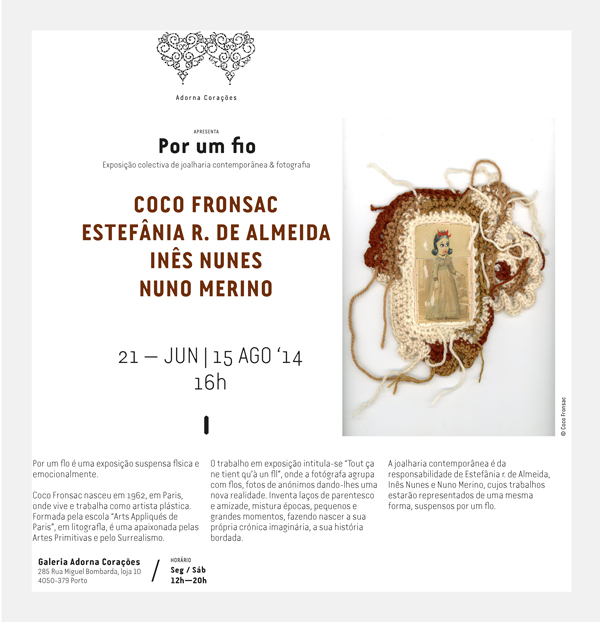 Por um fioExposição colectiva de joalharia, participa Inês Nunes | Membro PINGaleria Adorna Corações, Porto De 21 Jun a 15 Ago 2014 info+:Galeria Adorna CoraçõesRua Miguel Bombarda, 285, loja 10Porto {tortags,2837,1}
